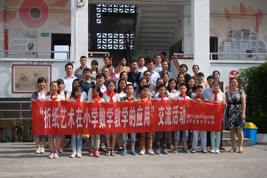 6月19日下午,西南大学数学与统计学院关心下一代工作委员会在北碚区复兴中心校开展了“折纸艺术在小学数学教学的应用”教学交流活动。数学与统计学院折纸工作室指导老师黄燕苹教授为该校师生上了一堂生动的折纸课,并与一线教师们交流了折纸技术在小学数学教学中的种种妙用。学院党委书记杨劲、副院长李忠如、工会主席肖红,团委书记冉思燕及10余名学生参加了此次志愿者活动,并与复兴中心校就教学问题进行了热烈讨论。