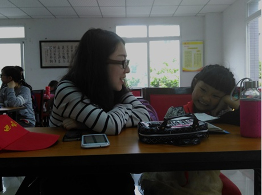 志愿者曾同学和她身边的小女孩相互抽背着英语单词,如果谁记错了,在下一轮游戏中就得相应的增加一定难度。一开始,小女孩对答如流,满脸洋溢着得意的欢笑,可过了两个回合后,她回答的速度逐渐变慢,错误也渐渐变多,小女孩嘟着小嘴,皱着眉头,不甘示弱地又拿起了课本复习,显得特别可爱。