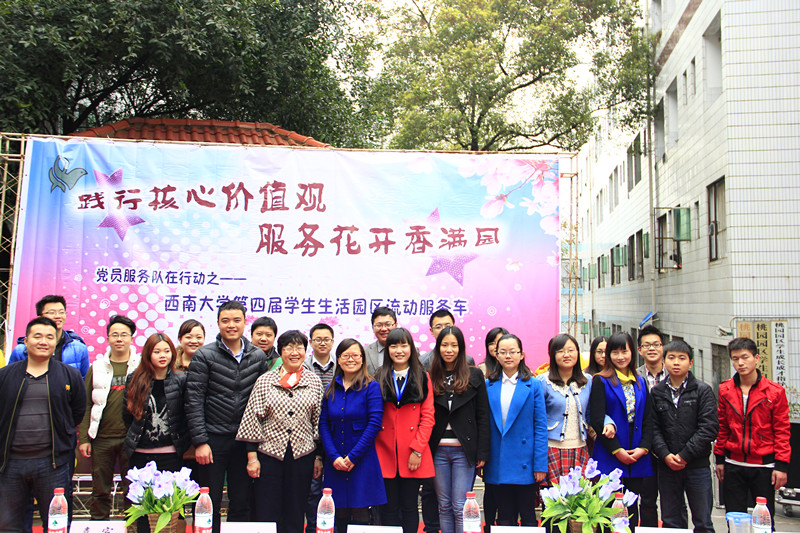 14日中午,党员服务队在行动之西南大学第四届学生生活园区流动服务车活动启动仪式暨桃园第一站于桃园文化广场举行。出席活动的嘉宾有关心下一代工作委员会肖义娟老师、桃园园区学生成长成才指导与服务中心主任梁华珍、副主任罗亮老师,辅导员何松、李容若、李心悦、许克松老师。同时,生活园区学生自律委员会总主席兼党员服务总队队长任政、副总队长赵景芳、副总主席邓丽、各兄弟园区学生党员服务队、自律委员会代表及园区通讯社代表也应邀参加了本次活动。